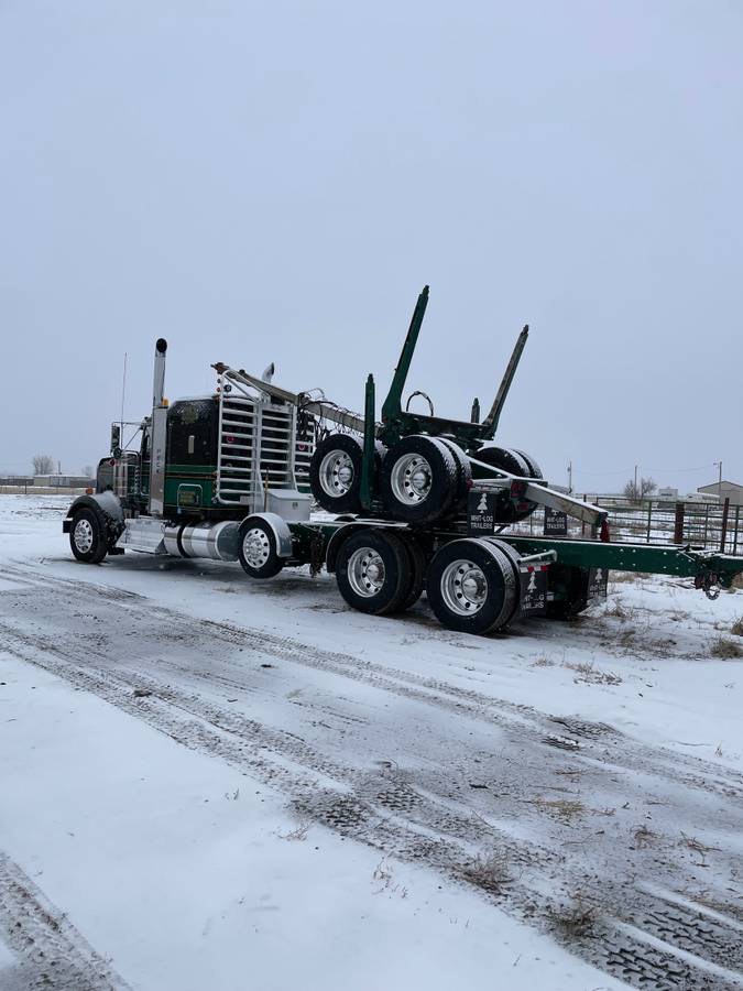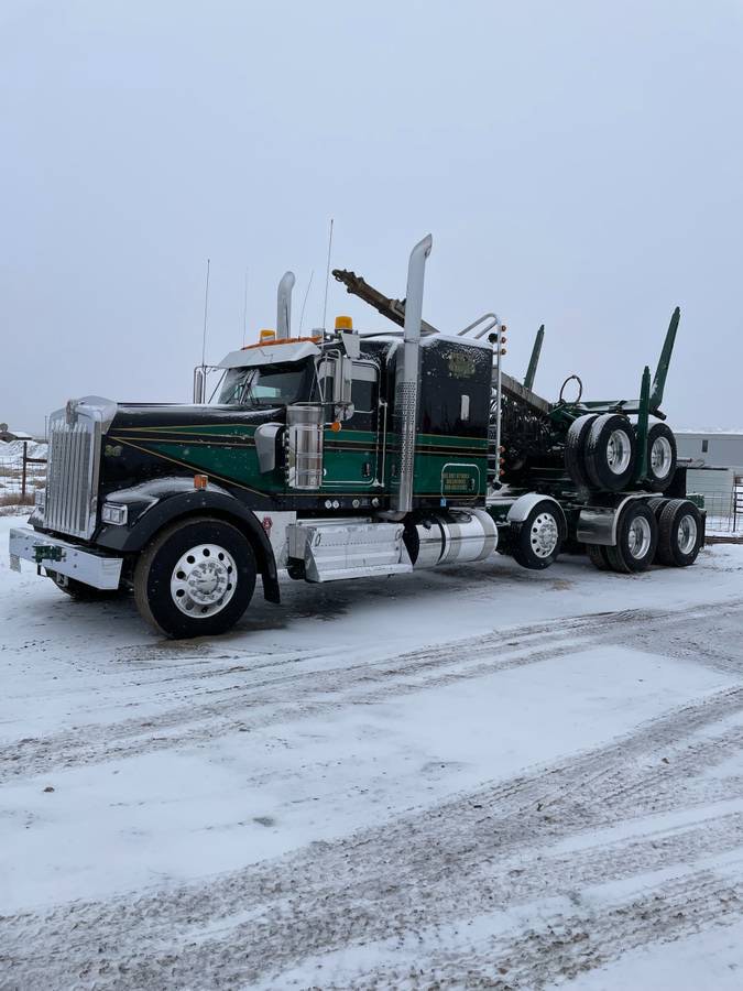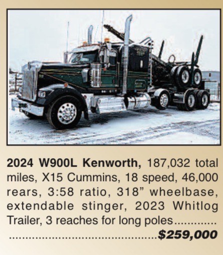 2024 Kenworth W900L premium pole hauler with Cummins X15, 18-speed, 46k rears (3.58), and 2023 Whitlog trailer with 3 reaches. 187,032 miles; 4,838.2 hours; 318″ wheelbase.